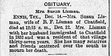 Susan Hodge Lisman's obituary, Dallas Morning News, Dallas, Tex., 15 Dec 1889.